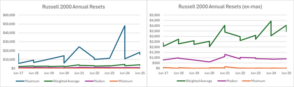 - While there have been extreme outliers in recent years (Super Micro for the small cap Russell 2000 in 2024 and Palantir for the Russell Midcap in 2025), even after eliminating those, the size profile for each index steadily marched upward as seen by their weighted averages of market capitalizations.